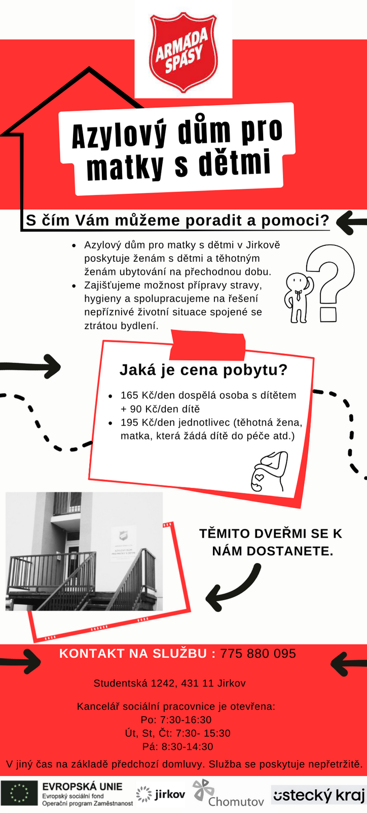 Sociální služba Azylový dům pro matky s dětmi Armády spásy v Jirkově je určena pro těhotné, matky nebo ženy, které mají dítě vlastní nebo svěřené do péče, které jsou fyzicky soběstačné a převážně pobývají na území města Jirkova a jeho okolí. Služba je poskytována obvykle na jeden rok a od uživatelů je očekáván aktivní zájem na řešení své nepříznivé sociální situace.